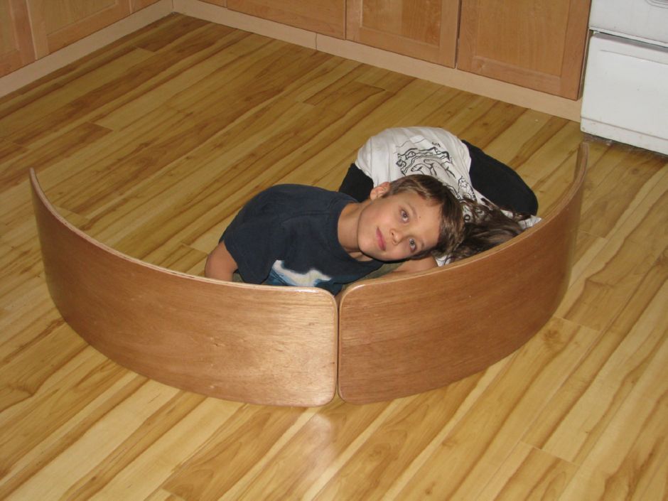 Made from six layers of 3 mm (1/8") plywood, these boards are laminated together in a curved form to produce a curved balance and stretching board that can withstand over 90 kg (200 lbs) of pressure. The boards' edges are all rounded over and the boards are finished with a natural, non-toxic shellac varnish, providing a smooth surface for skin of any age. Each board forms 1/4 of a circle.